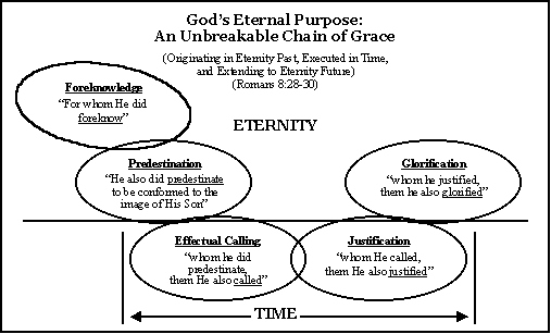 In these verses, we see an unbreakable chain of five links. The first two links in the chain are anchored in eternity past, before the creation of the world, and before any created being had existence. The first link refers to those persons whom God foreknew, or elected. As we have already seen in our study of Romans 9:1-24, God's sovereign election, or choice, of persons to salvation was unconditional, and took place before the foundation of the world. Then, in the second link of this unbreakable chain, we find that those same persons whom God unconditionally chose to salvation before the foundation of the world, were predestinated to be conformed to the image of His Son. This predestination also took place in the mind and purpose of God, before the foundation of the world. For the third and fourth links of this unbreakable chain, we move into the realm of time and space. In the third link of this unbreakable chain, we find that these same persons who were foreknown or fore-chosen, and predestined before the foundation of the world, are now viewed as being actually in existence, and they are now called. This calling is an effectual calling; it cannot fail because it is the outworking of God's eternal purpose. Those whom God has chosen and predestined before the foundation of the world are now effectually called by His grace into the New Birth, and to fellowship and faith in His beloved Son, which results in the fulfilment of the fourth link of this unbreakable chain: Those same persons who were chosen, predestined and called are now justified by faith in Christ, which means that by virtue of the redemptive work of the Lord Jesus in their behalf, they are declared righteous in Him. And finally, for the fifth link of this unbreakable chain of grace, we move into the realm of eternity future, where these same persons shall be glorified, which means that they shall at last reach the final goal of God's eternal purpose for them -- they shall be perfectly conformed to the image of God's Son, the Lord Jesus Christ. The chain is pictured in the illustration below: